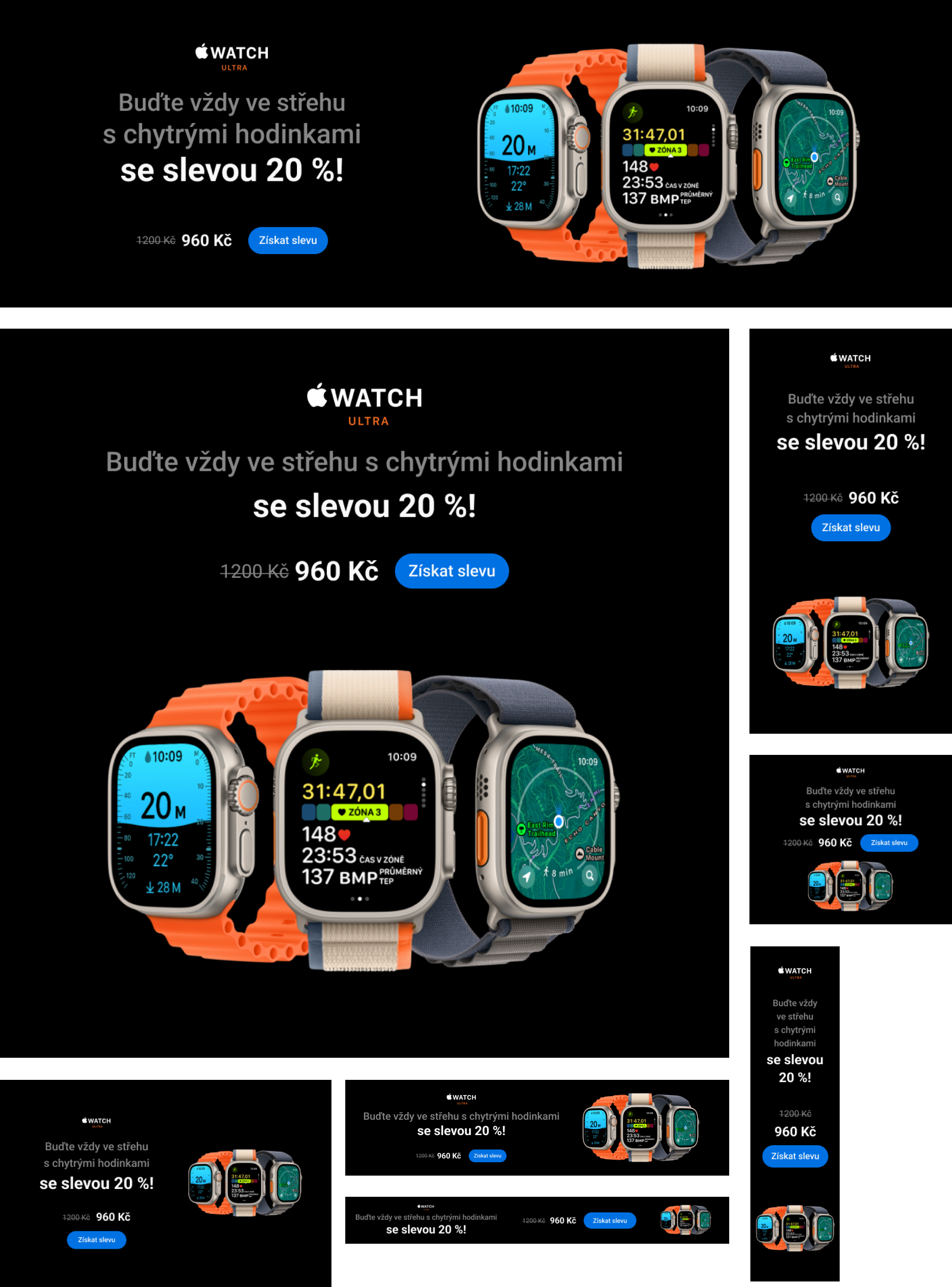 Google Ads bannery pro Apple Watch Ultra pro e-shop vznikly během kurzu Grafického designera. Bannery jsou připraveny v několika formátech, a to včetně Branding formátu, který standartně využívá např. Seznam/Sklik (viz obrázek výše).