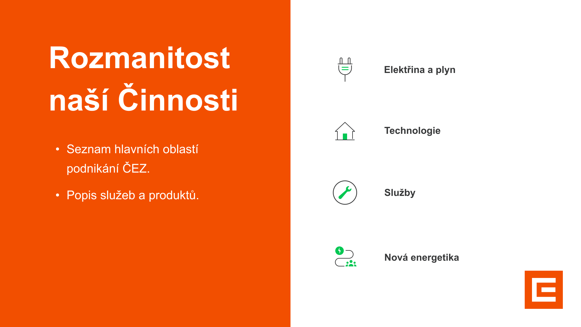 Prezentace pro ČEZ dodavatele plynu a elektřiny vznikla během kurzu Grafického designera. Součástí projektu je šablona jednotlivých slidů a samotná prezentace, která se skládá ze 7 slidů.