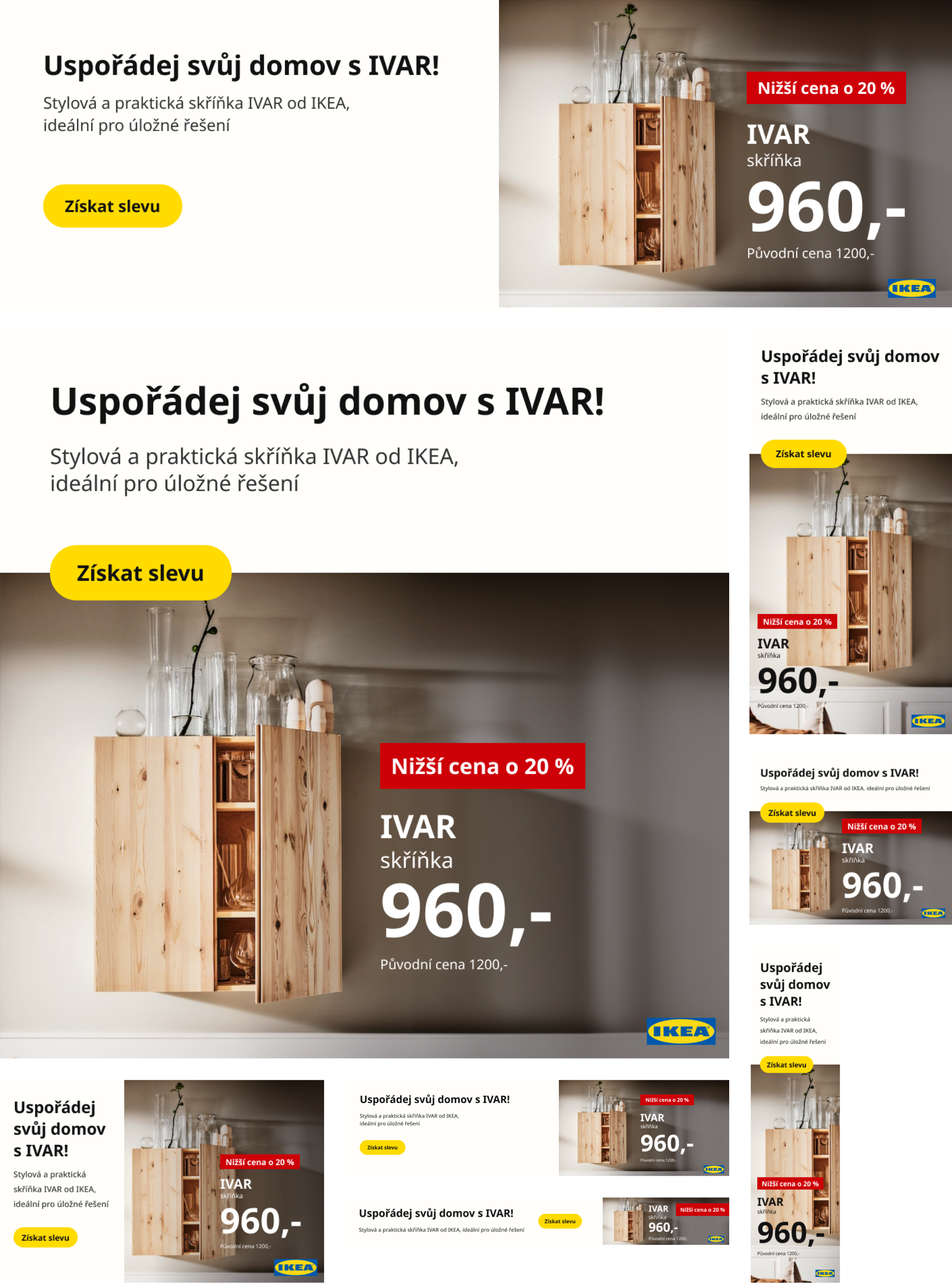 Google Ads bannery pro IKEA upozorňující na 20% slevu na skříně IVAR vznikly během kurzu Grafického designera. Bannery jsou připraveny v několika formátech, a to včetně Branding formátu, který standartně využívá např. Seznam/Sklik (viz obrázek výše).